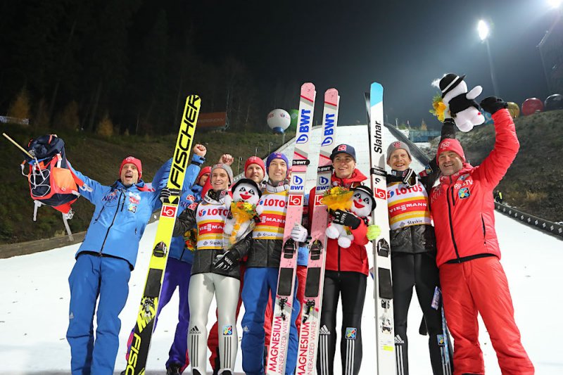 Norvégia győzelmével kezdődtek meg a 2017-18-as síugró világkupa küzdelmei a lengyelországi Wisłán. Az északi négyesfogat kiegyensúlyozott jó teljesítménnyel használta ki a többi nemzet rontásait, így a második sorozatban már végig magabiztosan vezettek a végül holtversenyes második helyet megszerző hazai lengyelek, és az új generációt is kipróbáló osztrákok előtt.