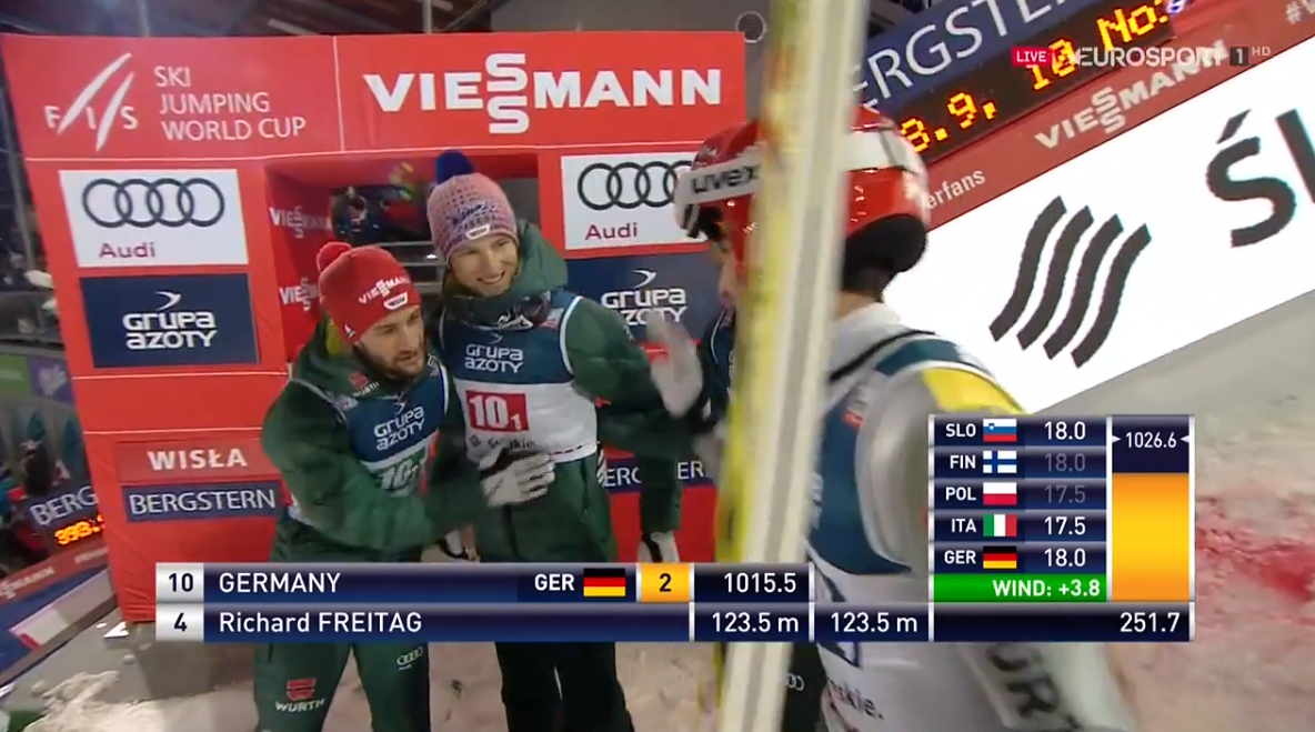 A győzelemről tehát az utolsó kör, ha úgy tetszik Kamil Stoch és Richard Freitag csatája döntött. A tavaly évad két legjobbja közül elsőként Stoch ugrott, aki egy fantasztikus ugrás végén 129 méternél landolt, ami után joggal bokszolt a levegőbe, hiszen a rosszul sikerült péntek után a mai nap már valóban a VK-győztes Stochot idézte. Freitag ugyan nem ugrott rosszat, azonban 123,5 méterrel nem tudta felvenni a versenyt Stocchal, így bár egy ugrással korábban elveszni látszott a siker, végül Lengyelország nyerte a versenyt, a németek pedig a második helyen zártak. A dobogó harmadik fokára az osztrákok érkeztek meg, miután Kraft (122 m) sem hibázott, ami kezdésnek nem rossz eredmény Andreas Felder alakulóban levő csapatától, bér a képet azért árnyalja, hogy ehhez a sima dobogóhoz azért a riválisok hibái is kellettek.