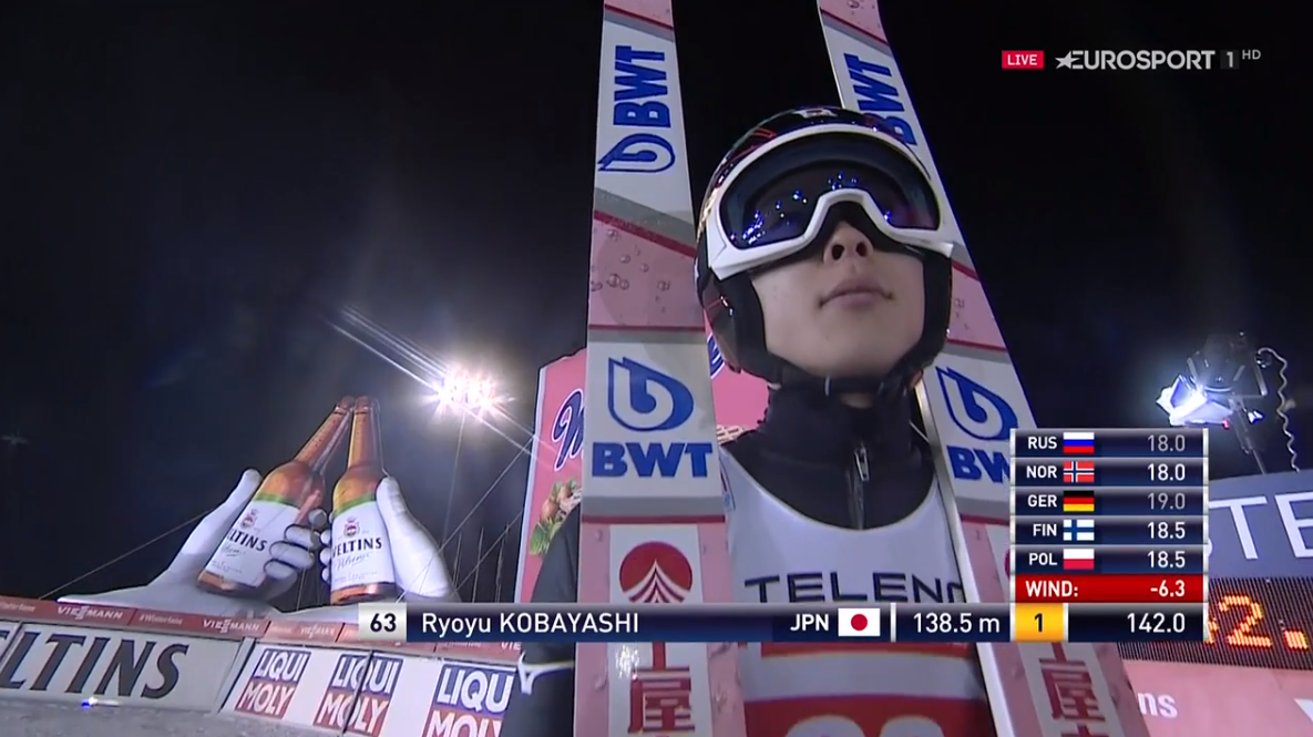 Következett viszont Kamil Stoch (2.), aki 140,5 méterig vitorlázva át tudta venni a vezetést, ami három ugróval a vége előtt már csaknem biztos dobogós helyet jelentett a címvédőnek. Sokáig azonban nem állt az élen a Stoch, ugyanis Ryoyu Kobayashi (1.) egy sokkal enyhébb szélben bemutatott 138,5 méteres ugrással meg tudta előzni, ez pedig, mint kiderült győzelmet ért ma japán ugrónak. Az a szembeszél ugyanis, ami Kobayashinál valamelyest gyengült, Stephan Leyhe (125,5 m 16.) ugrásánál már egészen minimális volt, a német ugró így nem tudta megközelíteni az élmezőnyt a mai napon. A wisłai győztes Evgeniy Klimov (121,5 m 31.) viszont láthatóan belehibázott az elugrásába, így végül a legjobb 30-ból is kicsúszott.