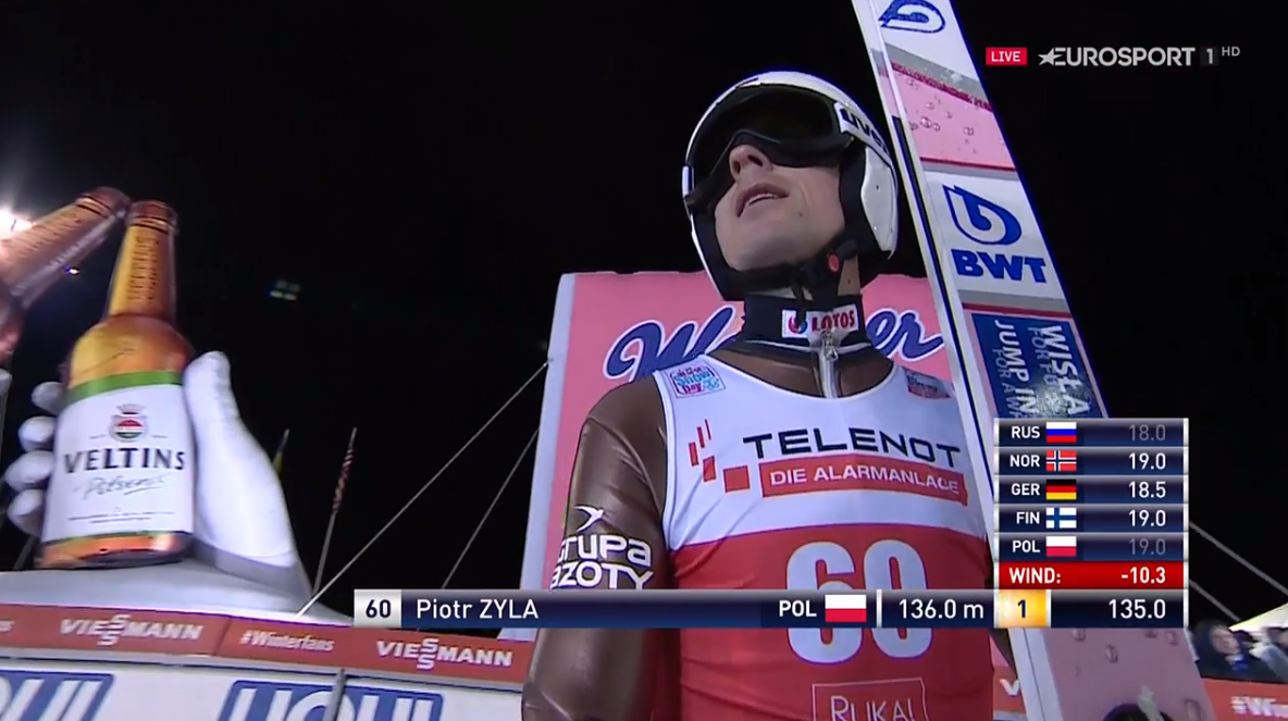 Dawid Kubacki (35.) viszont 120 méterrel ma igencsak alulteljesített önmagához képest, és végül pontot sem szerzett, és a finnek reményei ellenére hasonlóan járt Antti Aalto (122 m 32.) is, aki ma nem tudta megismételni a bravúros wisłai szereplését.
