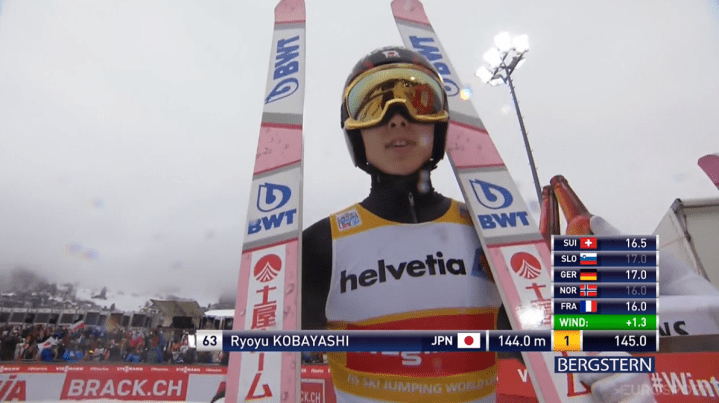 Jól feküdt a sánc Kubacki után Kamil Stochnak (2., 138,0 m) is, aki végül három ponttal meg is verte honfitársát. Erős kontrasztot mutatott a lengyel ugrásához képest Johann André Forfangé (22., 126,5 m), aki a továbbjutók háts traktusát erősítette csak. Piotr Żyła (3. 137,5 m) tovább erősítette a lengyel csapat teljesítményét, hármas lengyel vezetést eredményezve, amikor már csak egy versenyző volt hátra… Viszont Ryoyu Kobayashi (1.) 144 méteres ugrással a sáncrekordot is beállította, és még telemark nélküli érkezéssel is magabiztosan vette át a vezetést.