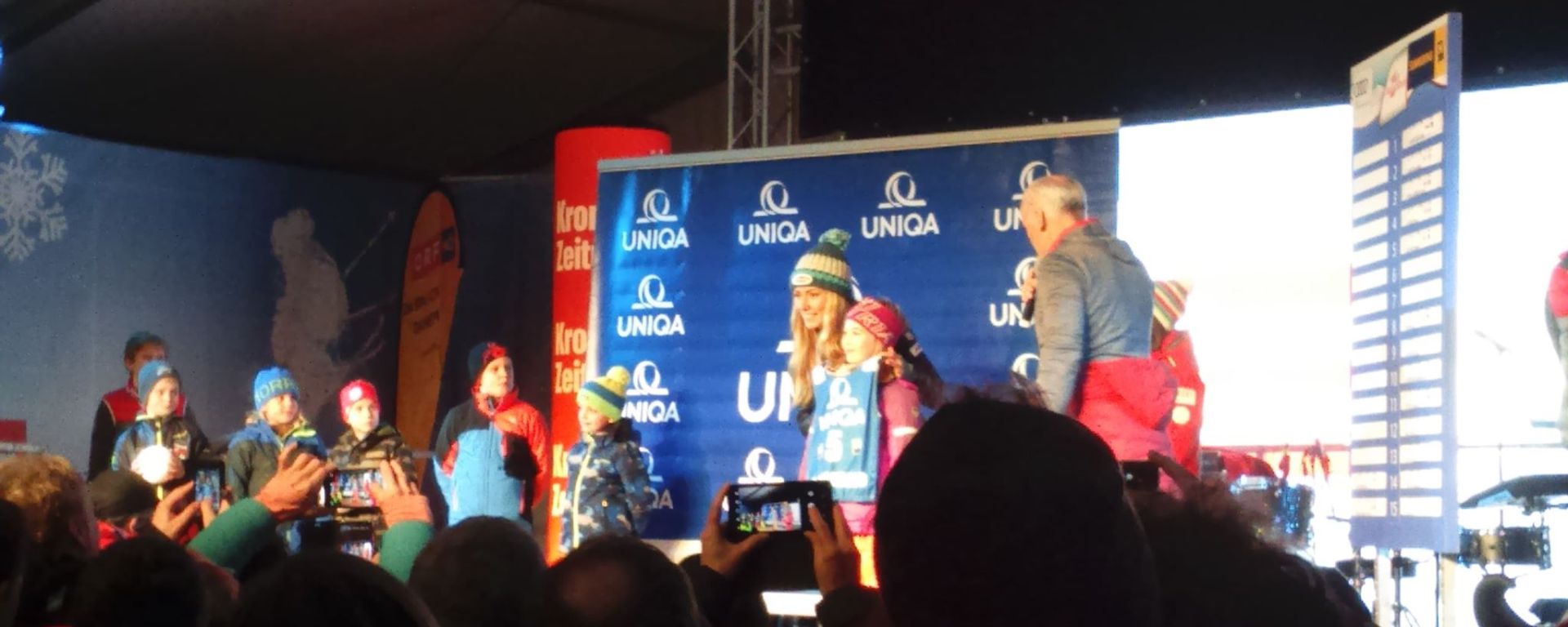 A futam után mi visszamentünk a szállásra vacsorázni, majd irány ismét vissza a pálya aljára. Estére már alig voltak páran, ismét az előző napi boltparkolóban tudtunk megállni. Az egyik sátorban rendezték az óriás díjátadóját és utána a rajtszámsorsolást. Itt a világranglista legjobb tizenöt helyezettje választhatott a helyi síklub gyerekei kezéből „hógolyókat”, amiben a másnapi rajtszámukat találták. Eközben rövid interjút készítettek velük. A legnagyobb rajongás természetesen Schildet, Liensbergert és Truppét övezte. Wendy Holdener volt viszont a sorsolás fénypontja: a svájci lányt egy ötfős rajongótábor kísérte, egyikőjüknek kérte a színpadról, hogy énekelje a közönség a Happy Birthdayt.