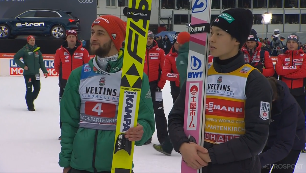 Következett viszont Ryoyu Kobayashi (1.), aki az obersdorfi győzelemmel a zsebében és a remekül sikerült edzések után az első számú esélyesnek látszott a mai verseny. A japán ugró egy 136,5 méteres ugrással ennek a várakozásnak meg is felelt, igaz, csak a szélkompenzációnak köszönhetően, és mindössze 2 tizeddel tudta megelőzni a minden értelemben legfőbb kihívójává előlépő Eisenbichlert, aki így a turné összetettben is mindössze 6 tizeddel volt tőle lemaradva. A kvali-győztes Dawid Kubacki (3.) ugrása viszont még hátra volt az első körből, a lengyel 133,5 méterre a két éllovasra nem volt veszélyes, de a 3. helyre azért befért.