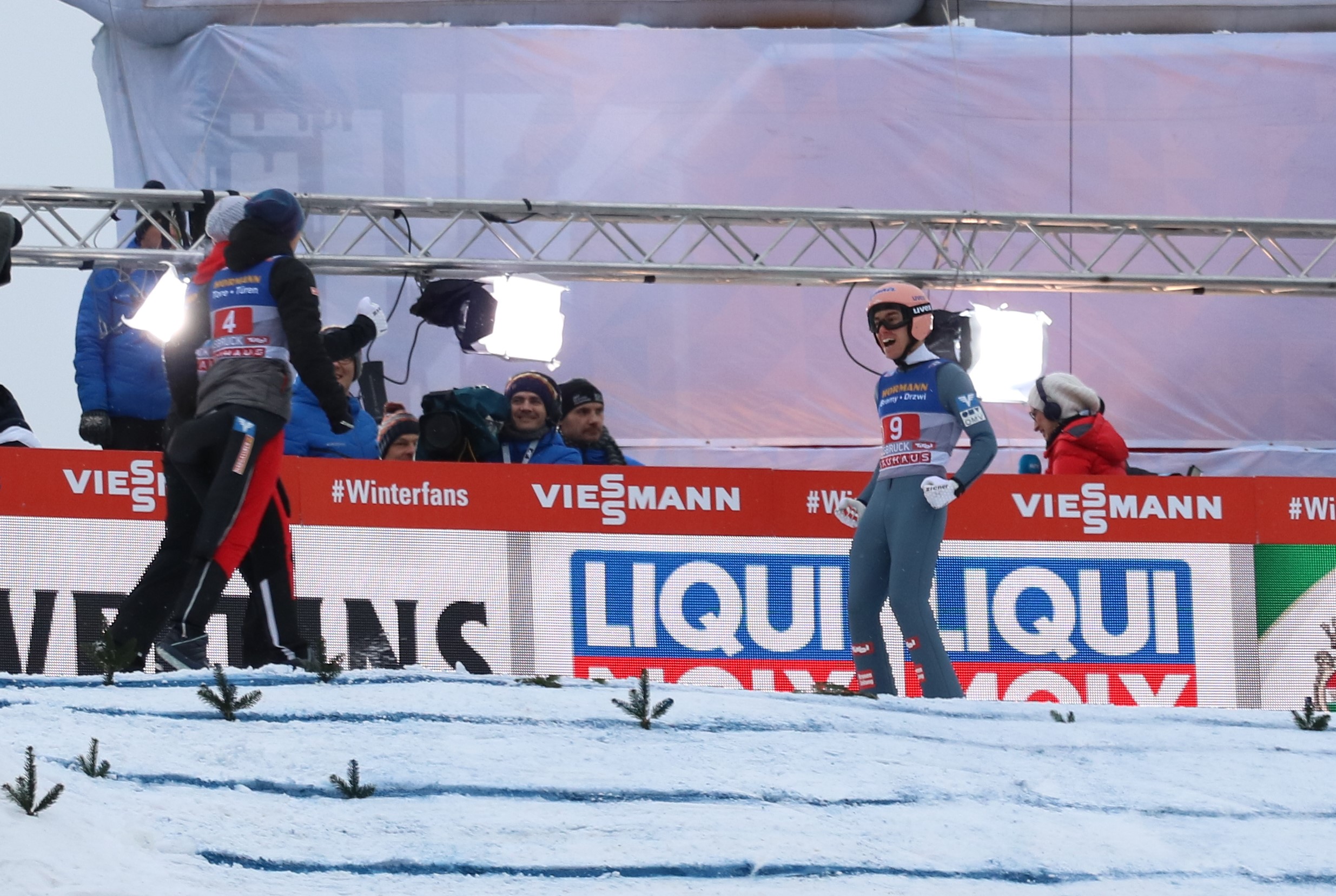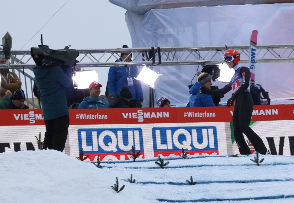 De nem sokáig, ugyanis Stefan Kraft (2.) egy 129,5 méteres ugrással, a stíluspontoknak és a szélkompenzációnak köszönhetően megelőzte a norvégot, a hazai szurkolók legnagyobb örömére. Következett Stephan Leyhe (5.), aki 129 méterrel bejött harmadiknak, majd a négysánc-összetett pillanatnyi bronzérmese, Dawid Kubacki (10.) repült 130 métert, a nagy szélkompenzációs levonás miatt, azonban csak az üldözők közé sorolt be vele.