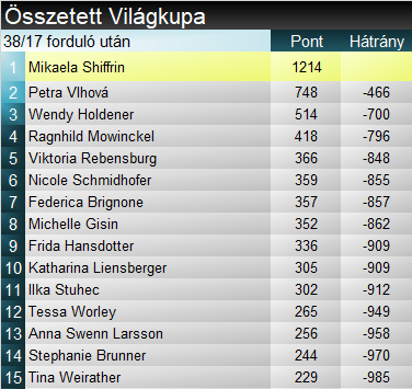 A Mikaela Shiffrin-Petra Vlhová páros idén ötödször végzett ebben a sorrendben a dobogón. Jelenleg 100 pont az amerikai előnye a szakági pontversenyben.