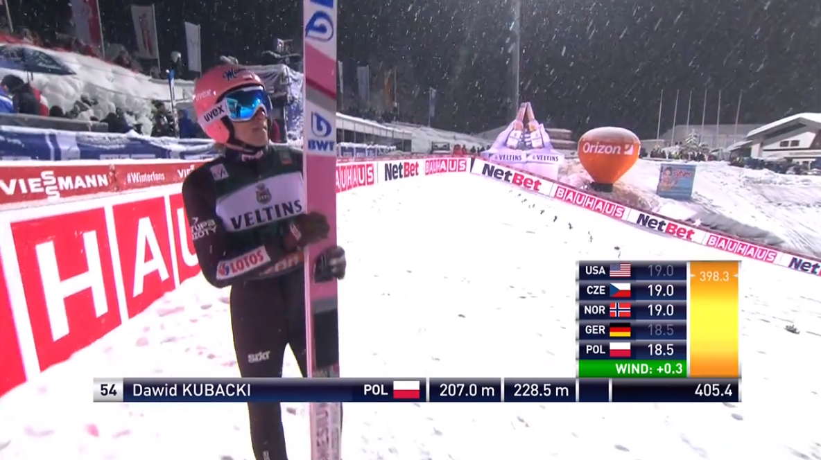 Markus Eisenbichler (10.) közvetlenül az elugrás után kisebb korrekcióra kényszerült a levegőben, így végül 206,5 méterig jutott, amivel nem tudott beleszólni a dobogós helyekért zajló csatába. Annál inkább Kamil Stoch (1.)! A lengyel klasszis ugyanis 227,5 métert repült, ráadásul a talajfogása is mintaszerű volt, így magasan, majd’ 8 pont előnnyel vette át a vezetést Kubackitól. Piotr Zyła (4.) ezek után 220,5 méternél landolt, amivel pillanatnyilag három lengyel állt a mezőny élén, és fent volt még a toronyban Jakub Wolny is. Wolnytól persze szenzáció lett volna, ha sikerül megtartania a dobogós helyét, ezzel együtt nem ugrott rosszat, 211,5 méterrel végül 6. lett, ami pályafutása legjobb eredményét jelentette.