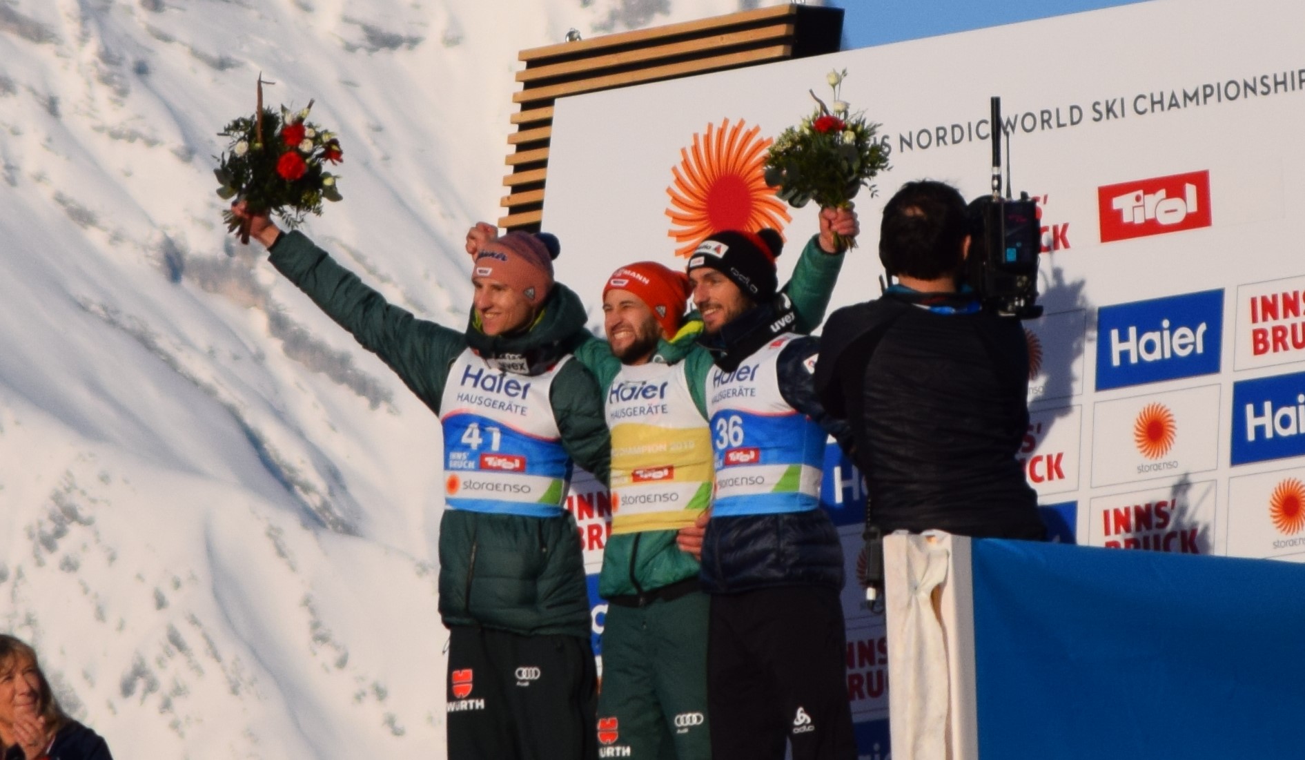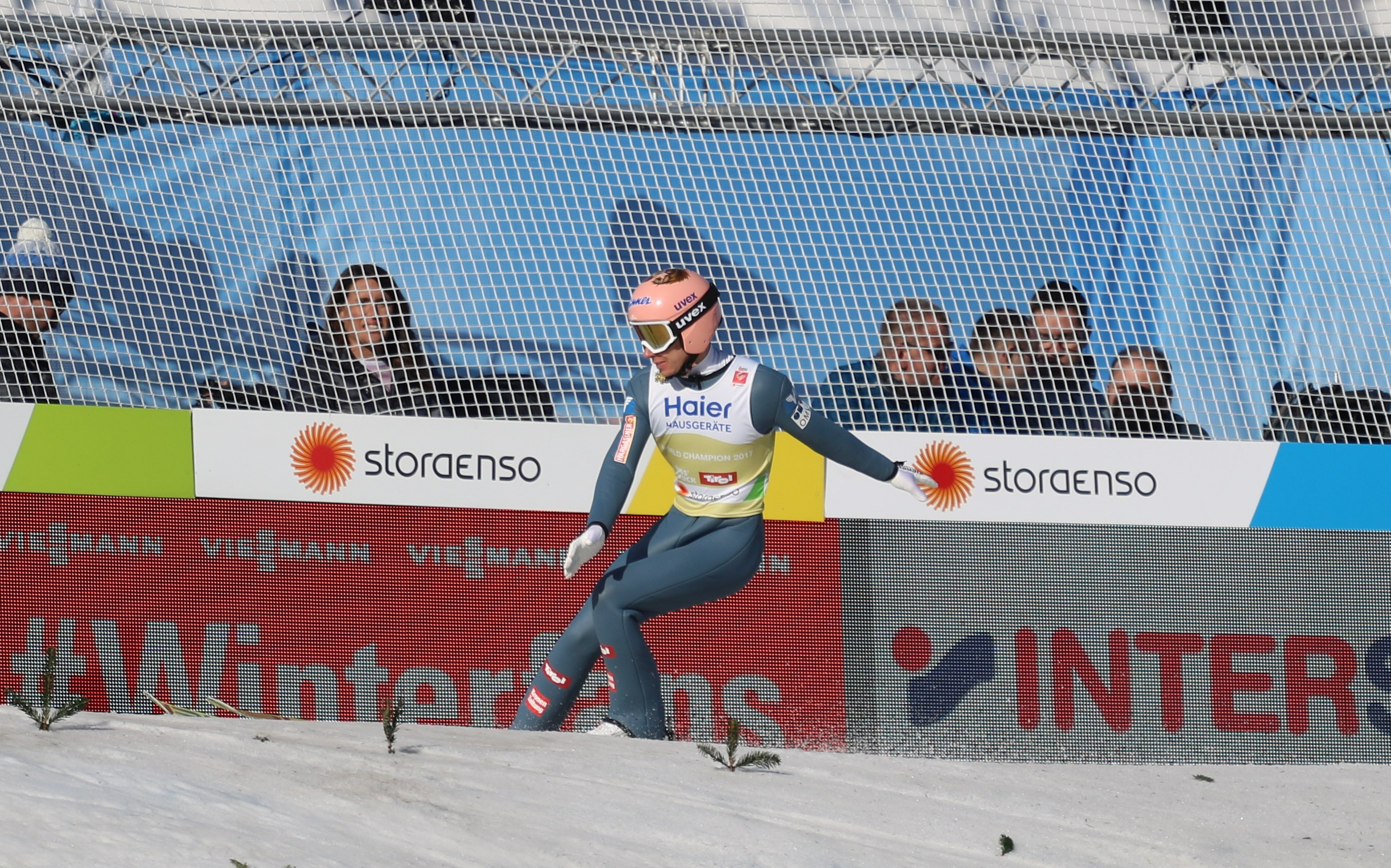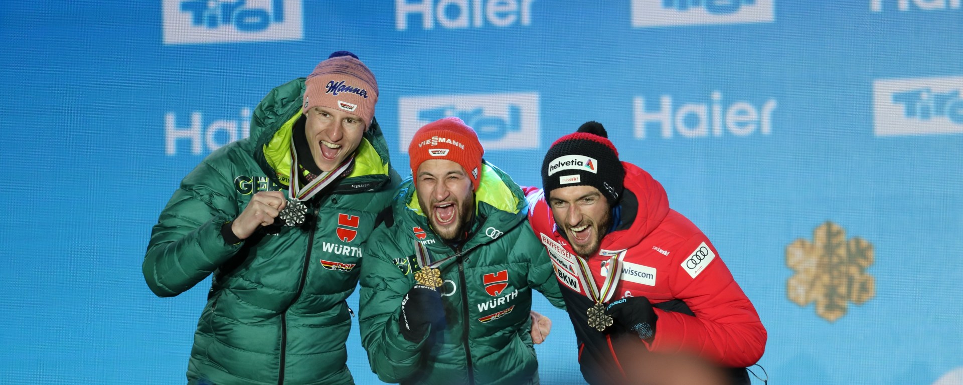 Pláne Killian Peier ugrása után. A svájci nem izgulta el a másodikat sem, 129,5 méterig szállt, amivel ugyan a versenyt nem nyerte meg, de bejött a harmadik helyre, Geiger mögé… és meg is rohamozták a csapattársak, és úgy ünnepelték, mint a németek Eisenbichlert, az „örök másodikat”, aki ma végre kitört ebből a szerepből és életében először nyert versenyt, méghozzá az egyik legfontosabbat karrierje során. Ezzel elmondhatjuk, hogy a dobogóra három olyan ember állhatott fel, akiknek mind fülig ért a szája, és mi mást is szeretne látni az ember, különösképpen egy világbajnokságon, mint három elképesztően boldog embert, aki úgy ünnepelte saját és egymás(!) eredményét, mintha legalább mindhárman bajnokok lettek volna!