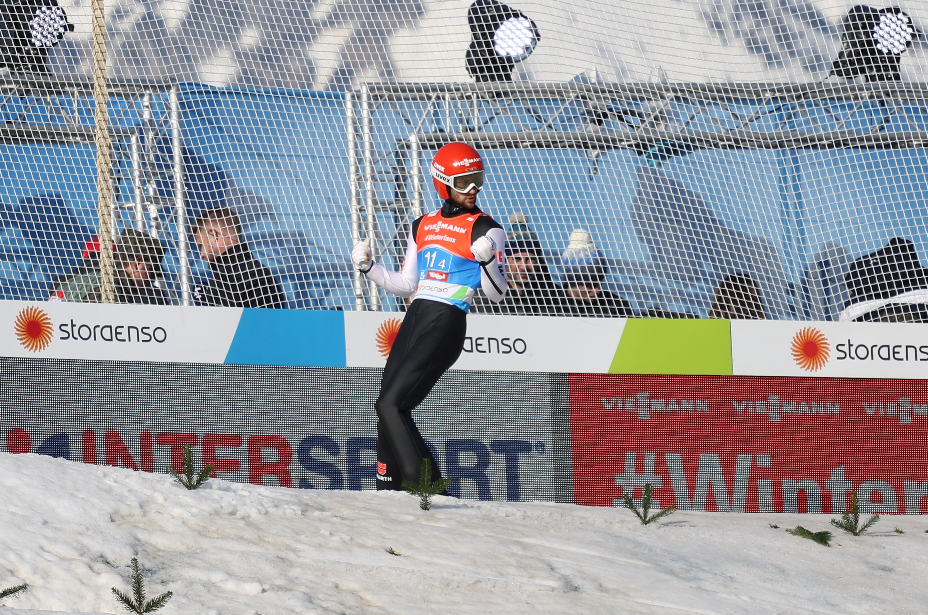 Az utolsó emberekre így tehát igazán nagy teher nem hárult, ugyanis az eredményeken csak egy igazán rontott ugrással lehetett volna változtatni. A csehek Roman Koudelka 122 méteres ugrásával így a 8. helyen fejezték a versenyt. A tegnapi bronzérmes Killian Peier 128,5 méterrel zárta a svájciak versenyét, és a fiatal versenyzőhöz úgy siettek ki a csapattársak, mintha legalább dobogóra állhatott volna a kvartett. Timi Zajc révén a szlovének feledhető, 117 méteres ugrással búcsúztak. Robert Johansson 121 méterével vált biztossá a norvégok 6. helye. Kamil Stochban (122,5m) reménykedhettek a drukkerek, hogy valami brilliáns ugrással majd felhozza a lengyeleket a dobogóra, ám ez ma elmaradt, így Lengyelország a negyedik lett. Ryoyu Kobayashi 123 méteres ugrással búcsúzott a Bergiseltől, a japánok ezzel megnyerték a bronzérmet. Stefan Kraft 123,5 métere jelentette az osztrákok számára az ezüstérmet, ami a német dominanciát elnézve jobbára egy arannyal ér fel a sógorok számára. Németország ugyanis legyőzhetetlen volt a versenyen, mutatta ezt az is, hogy az újdonsült világbajnok, Markus Eisenbichler (128,5m) megközelítette a 130 métert másodjára is. A németek ezzel toronymagasan nyerték meg a versenyt, és így lett világbajnok a Geiger – Freitag – Leyhe – Eisenbichler kvartett.