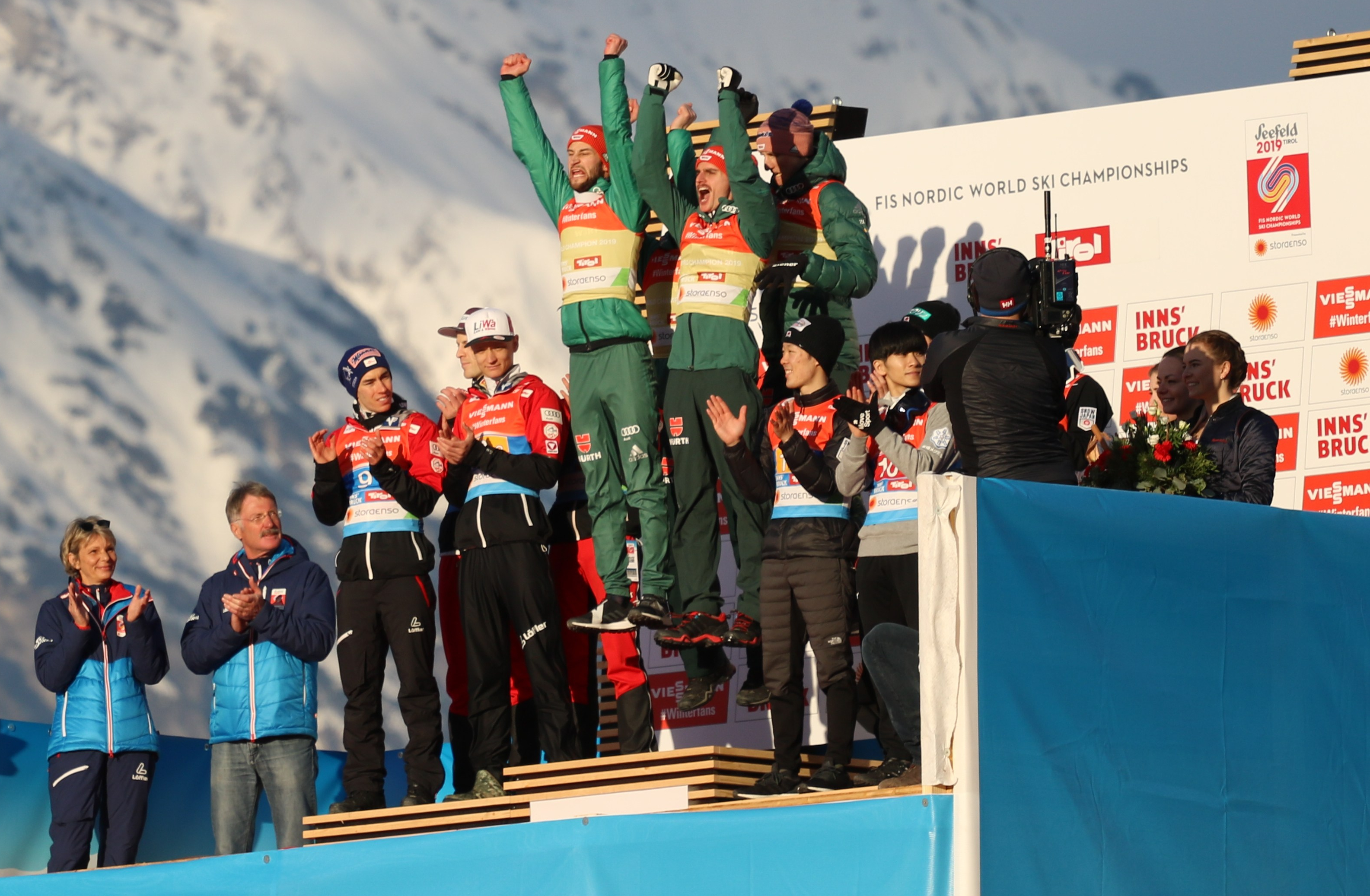 A szombati egyénit követően a vasárnapi csapatversenyt követően is a németek örülhettek a legjobban Innsbruckban, a Karl Geiger, Richard Freitag, Stephan Leyhe, Markus Eisenbichler összeállítású négyes ugyanis utcahosszal szerezte meg az aranyérmet a házigazda osztrákok és a japánok előtt.