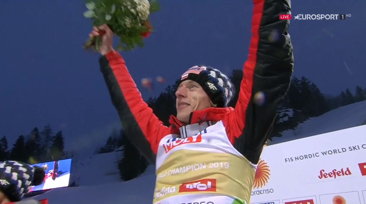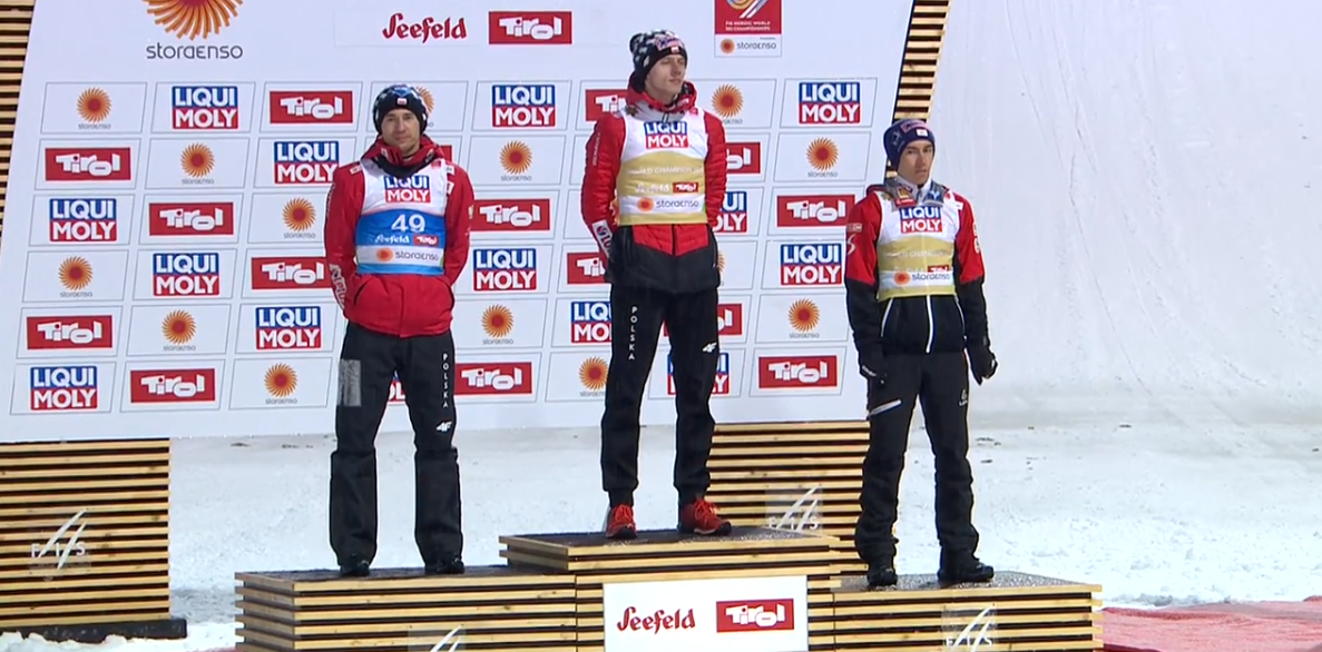 Miután pedig Karl Geiger (92,5 m 18.) és az első sorozat legjobbja, Ryoyu Kobayashi (92,5 m 14.) sem bírt az elemekkel a csapattársak már a vállukon vitték körbe a 28 esztendős zakopanei ugrót, hiszen bármilyen hihetetlen a 27. helyről győzni tudott, ezzel Adam Małysz és Kamil Stoch után ő lett a lengyel síugrás harmadik egyéni világbajnoka! Az ezüstérem ráadásul Kamil Stoch nyakába került, aki a val di fiemmei arany után második érmét nyerte egyéniben, a bronzérmet pedig az osztrák szurkolók örömére Stefan Kraft szerezte meg, aki a csapatban megszerzett ezüst után így ismét dobogóra állhatott a világbajnokságon.