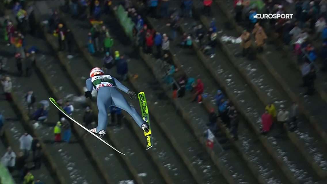 Piotr Zyla (133,5m 9.) kezdte meg a legjobb tíz csoportját – egy beülővel lejjebbről, mint az előttük ugró 20 versenyző – utána következett Johann André Forfang, aki végül a hetedik helyen zárt 131,5 méteres második ugrását követően. Robert Johansson (130,5m) épphogy kicsúszott a top 10-ból, a 11. lett. Peter Prevc (132m) tényleg egyre jobb és jobb eredményekkel “jelentkezik”, ma is a 8. lett.