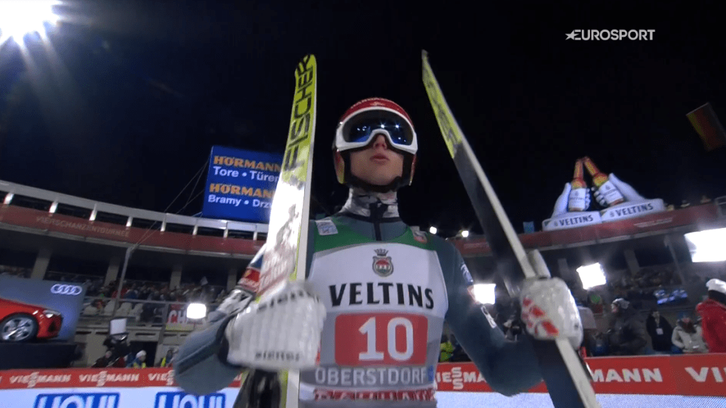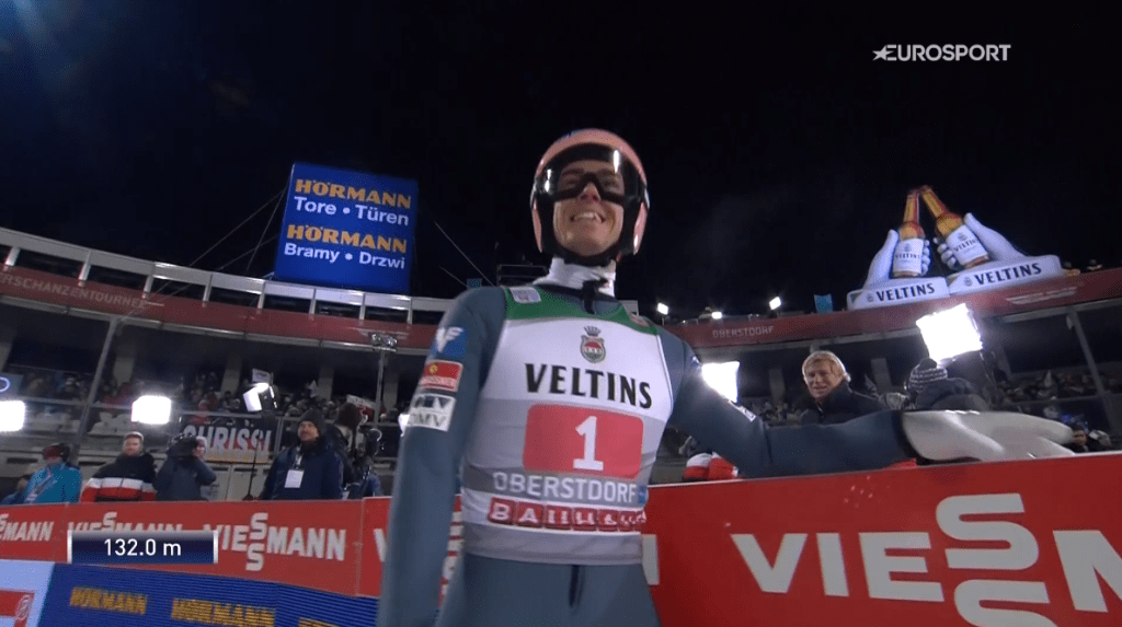 Dawid Kubacki (3.) ugyanakkor kicsit jobb szélviszonyok között 133 métert repült, amivel átvette a vezetést is, sőt végül dobogóra is állhatott ugyanis Stefan Kraft (4.) hiába ugrott 132 métert elég mélyre került a súlypontja a talajfogásnál, így gyengébb stíluspontjai miatt nem tudta megtartani a harmadik helyét. Kraft után Karl Geiger (2.) következett, aki a német közönség nagy örömére 134 méterrel megelőzte Kubackit, ezzel már biztosan megvolt legalább a második hely a hazaiaknak. A német győzelem útjába egyedül csak Ryoyu Kobayashi (1.) állhatott, aki azonban nem remegett meg, és ugyancsak 134 métert repülve akárcsak tavaly, ismét győzelemmel kezdte a Négysáncversenyt!