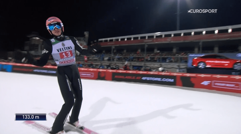 Marius Lindvik (139 m 6.) repült ezt követően egy hatalmasat, ám hiába jutott túl a második piros vonalon is, a telemarkot nem tudta megcsinálni, így csak a második helyre fért be Kubacki mögé. A zsűri erre hamar lehozta a beülőt a 12-es kapuba, ettől függetlenül a körülmények jók voltak továbbra is, amikor a hazaiak legnagyobb esélyese, Karl Geiger (2.) készülődött az ugráshoz. Geiger ki is használta az esélyt és repült egy hatalmasat, 135 méteres ugrásával át is vette a vezetést.