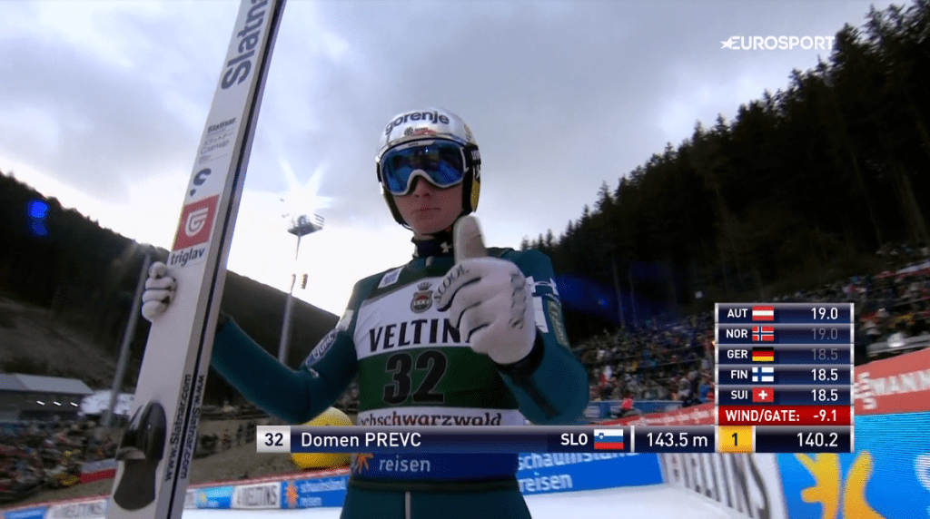 A verseny elejére jellemző erős szembeszél ekkor egyébként úgy általában is megszűnni látszott, így a zsűri is alkalmazkodott a megváltozott körülményekhez és a 8-as kapuból jöhetett a folytatás. Gregor Schliernzauer (19.) következett, aki 134 méterrel a harmadik helyre tudott bejönni, majd érkezett Domen Prevc (5.), aki már a próbasorozatban is villogott, most pedig 143,5 méterrel repült a mezőny élére.