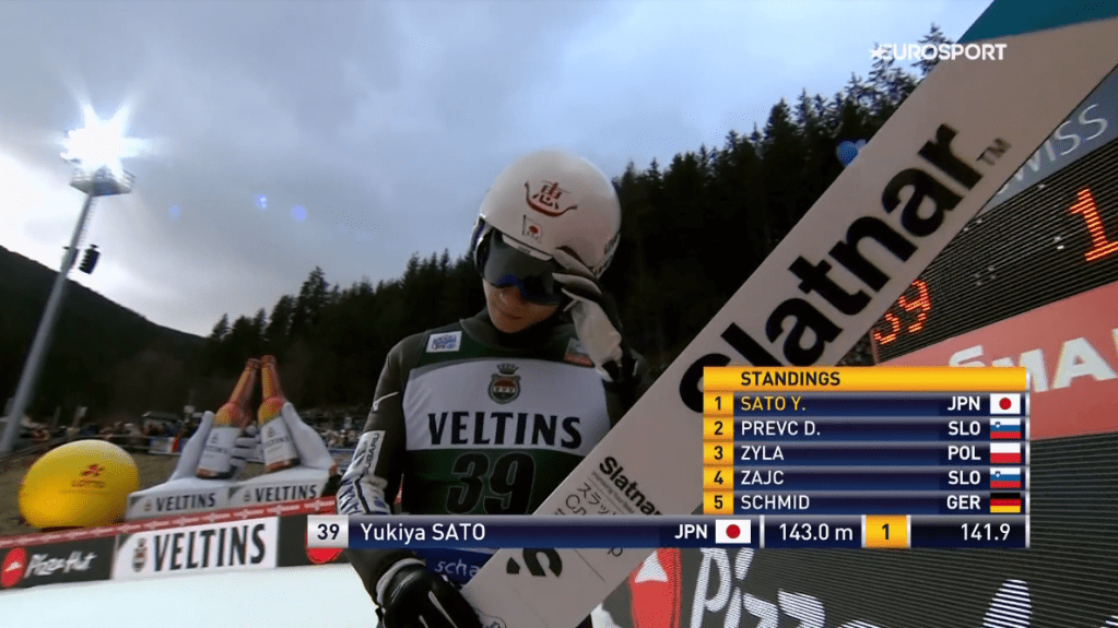 Daniel Hubertől (22.) láttunk ezután egy 132 méteres kísérletet, majd Stephan Leyhe (14.) ugrott 135 métert, amivel negyediknek jött be, majd következett Piotr Zyła (6.), aki 141 méterig vitorlázva bejött a második helyre. Yukiya Sato (3.) viszont 143 méterrel őt is túlszárnyalta, sőt, át tudta venni vele a vezetést Prevctól.
