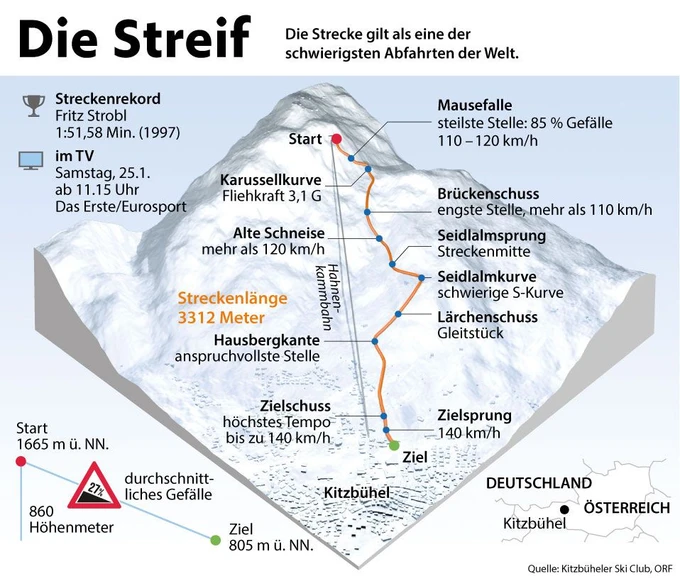 Az évfordulót teljes pályán ünnepelték a sízők. A Streifen töltött közel két percet két, nagyjából 30 másodperces pokoljárás foglalja keretbe. A 85%-os Mausefalle 60-80 méteres ugrással borzolja rögtön a kedélyeket. Az „egérfogóban” példátlan nyomásnak vannak kitéve a sízők, testtömegük tízszerese nehezedik rájuk. Itt, majd a félfordulatos balosban, a hírhedt Karussellben („körhinta”) máris minden adott ahhoz, hogy valaki elbukja a győzelem, illetőleg az igazán jó eredmény lehetőségét. A Streif múltbéli legjobbjai vallják, a következő egy perc arról szól, hogy feldolgozzák a sokkhatást, amit az eleje okozott, valamint, hogy felkészüljenek a záró fél perces őrületre. Merthogy hiába volt addig minden, aki nem képes konszolidáltan bevenni a Hausbergkantét, illetve elrontja a traverzet, eltűnhet a süllyesztőben.
