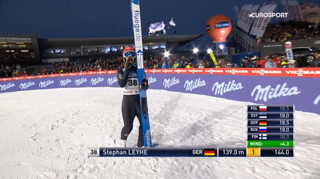 Daniel Huber (14.) ugrott ezután 130,5 métert és jött be vele harmadiknak, majd Piort Zyła (7.) tiszteletére lengtek a fehér-piros zászlók, aki egy 134 méteres repüléssel meghálálva a biztatást a élre tudott állni. Stephan Leyhe (2.) azonban még ezt is felülmúlta és egy 139 méteres ugrással átvette a vezetést Zyłatól. Yukiya Sato (20.) 127 méteres ugrása ellenben nem volt veszélyes az élbolyra, mint ahogy Anze Lanisek (27.) is csak egy közepesnek mondható, 124 méteres kísérletet mutatott be az első sorozatban.