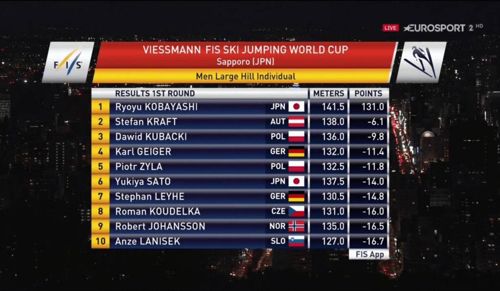 A lengyel Dawid Kubacki második ugrása (126,0 m) úgy tűnt, hogy nem lesz elég a dobogóhoz, azonban Ryoyu Kobayashinak sem volt szerencséje, hiszen a második sorozatban bemutatott 110 méteres ugrásával csak a tizenötödik helyen fejezte be a versenyt.