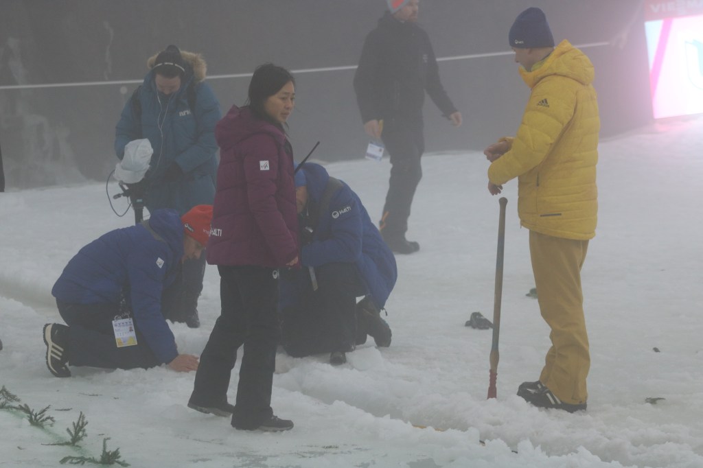 A másik meg a szervezők elkeseredett küzdelme annak érdekében, hogy az esőzés miatt az ellenlejtő aljában összegyűlt kisebb tavacskát megszüntessék, enélkül ugyanis akkor sem lehetett volna versenyezni, ha történetesen alábbhagy a szél, mint ahogy ez valamelyest meg is történt estefelé, mire a lányok versenyére került volna sor. Hiába mondta reménykedve még jó 2 órával a “vég” előtt Miran Tepes (aki manapság a női versenyeken “szélmester”, azaz helyettes versenyigazgató), hogy az előrejelzések szerint este jobb idő lesz, az érkezőlejtő vége menthetetlennek bizonyult. Amit egyébként a résztvevők többé kevésbé már jó előre tudtak, vagy legalábbis sejtettek, de hát a zsűri, mint oly sokszor, megpróbálkozott a halogatással mielőtt kimondták a végső ítéletet a versenyek felett. Lehetséges megoldásként egyébként azt találták ki, hogy a lejtő aljában ástak keresztbe egy árkot, amiben megpróbálták elvezetni a vizet, ám nem jártak igazán sikerrel, hiába lapátolt lényegében a helyi rendezők csapata mellett a teljes zsűri is.