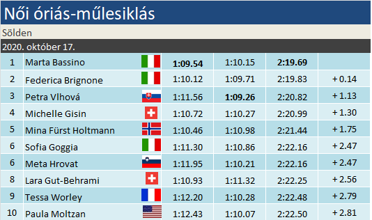 Vlhová pódiuma ezután dőlt el. Holtmann (5.) előnye már 1,10-re rúgott, amit azért már illett volna megtartani. Nem így történt, a letörésnél következett két ormótlanul vett kanyar. A Gisin mögötti széles sávot persze sikerült betöltenie. Brignone (2.) már nem teketóriázott, mert bár Vlhová legerősebb szektorán lefeleződött előnye, a befutó szektorban egy század híján szekundumra tornázta vissza a különbséget. Feladta a leckét egy kicsit Bassinónak (1.). Aki megoldotta úgy, ahogy kell! A meredeken voltak nehéz pillanatai, de nem remegtek meg lábai. A végtempóban jócskán elmaradt, de bő 1 tized kitartott előnyéből. Olasz erődemonstráció Söldenben!