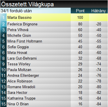 Moltzan, Ellenberger és Miradoli alkotta az első hármast, amikor a mezőny fele már leért. A maradék 15 síző mindegyikének ez nem jött össze, Tviberg nagy igyekezetében kiütötte támaszlábát a lejtő közepén. Worley (9.) másodjára odatette magát, szűk rádiusszal síelte meg a meredeket. A záró etapra lecsökkent sebessége, így kicsi, kétszázados előnnyel tudott csak élre állni. Ezt használta ki Hrovat (6.) . A szlovén lány szektorai végig zöldültek, a pici különbséget a célban emelte több tizedesre. Azonnal érkezett az utolsó szlovén. No, nem a célba! Robnik teljesen kiesett a ritmusból a letörésnél, menthetetlenül kisodródott a pályáról. Ígéretéhez híven délután sem adott alább a rizikóból Truppe (15.). Ezúttal túlzásba vitte a késve vett kanyarokból. Petra Vlhová (3.) próbálta menteni a menthetőt. Kontrollált meredekkel, beleköthetetlen futammal alaposan odacsapott. Közel másfél s-cel vágódott a lista élére, az addigi legjobb időnek 8 tizedet osztott ki. Az utolsó osztrák reménysugár hamar elillant. Brunner (17.) csúnyán belefékezett a letörésbe, onnantól nem volt esélye jó eredményre. Nehéz persze leírni, mit jelent a „jó eredmény” egy olyan síző esetében, aki a megelőző két évben háromszor szakította el keresztszalagját?