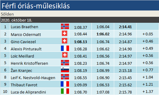 A nőknél az olaszok számítottak a szezonnyitó favoritjának, a férfiak óriás-műlesiklása előtt a norvég válogatott szurkolói lehettek a legbizakodóbbak. Nem borult e téren a papírforma ma sem, igaz, nem a szakági címvédő Kristoffersen, s nem az összetett előző évi győztese, Kilde pezsgőzhetett a dobogó tetejéről. Lucas Braathen, az új generáció üdvöskéje vitte a prímet, először győzött a Világkupában. Remek napot zártak a svájciak: három TOP-5 helyezésből kettőt dobogóra sikerült váltani. Marco Odermatt egy paraszthajszállal csúszott le a második helyre, míg Gino Caviezel először ünnepelhetett dobogón. Pintutault a negyedik, Kristoffersen az ötödik helyen végzett.