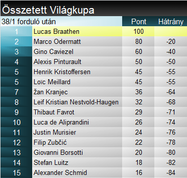 Lucas Braathen hatodik TOP-10-helyezését máris győzelemre váltotta. A háromszoros junior-világbajnoki érmes norvég két szezonnal korábban szakágit nyert az Európa Kupában, köszönhetően három óriás-műlesikló sikerének. Az anyai ágon brazil származású 20 esztendős síző a jövő nagy ígérete. Marco Odermattról is elmondható legalább ugyanez, na hiszen, egy hatszoros junior-világbajnokról van szó. Ötödik dobogós helyezését ünnepelte ma, s akár a kristálygömbért szóló harcba is beleszólhat ezen a télen. Gino Caviezelt elsőként láthattuk VK- dobogón, legalábbis egyéniben. Rászolgált már erre, elvégre 13. alkalommal zárt a TOP-10 között.