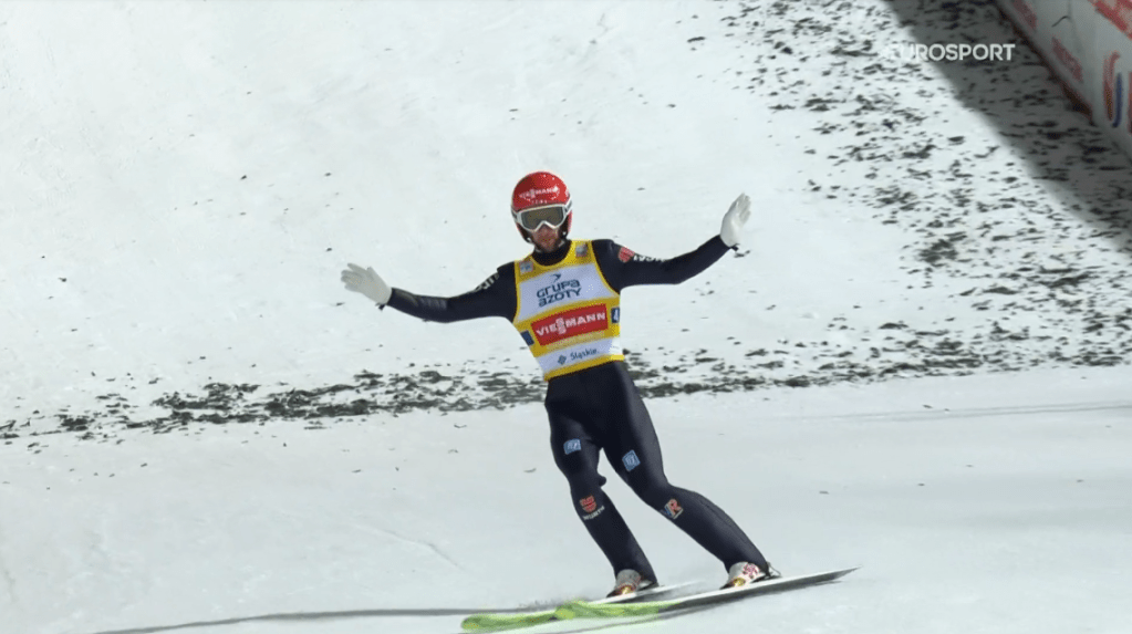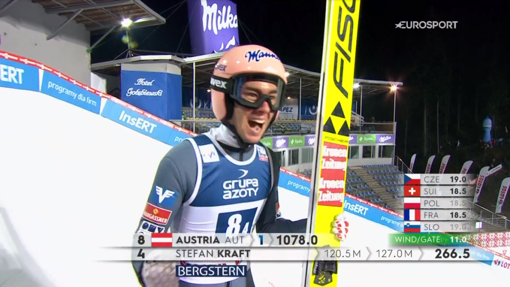 A nap leghosszabb ugrását az utolsó előtti csoportban láthattuk Daniel Hubertől, aki 135 méternél landolt, igaz a telemarkot már nem tudta megcsinálni, így mindössze 3,5 pontos előnyt adott tovább a csapat utolsó emberének, Stefan Kraftnak. A németek ugyanis Karl Geiger 130 méteres ugrásával tartották velük a lépést, ahogy egyébként jól ugrott a lengyelektől Dawid Kubacki is (131 m) ám ezzel együtt is 14 pont hátránnyal álltak a németekhez képest az utolsó ugrások előtt.