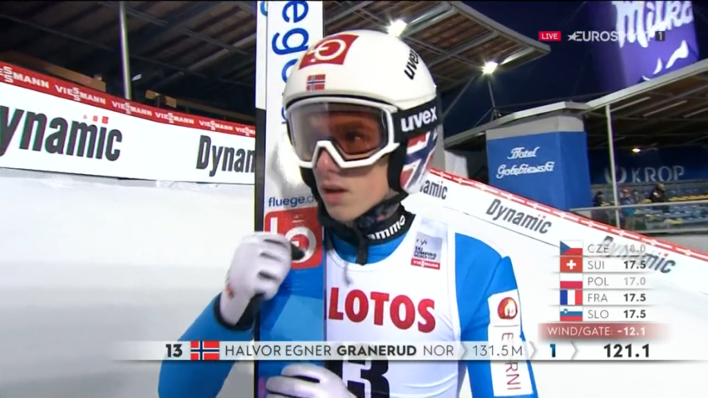 A délután azonban nem indult túl jó előjelekkel, hiszen a próbasorozatot törölni kellett az erős szélviszonyok miatt. A versenyt meglehetősen változó körülmények között, de végül a tervezett időpontban elindította a zsűri. Nem is kellett sokat várnunk az első kiemelkedő ugrásra, a négyes rajtszámmal ugró norvég, Sander Vossan Eriksen (17.) 129 méterig repült, ám a zsűri – ezúttal jogosan – lejjebb is hozta a beülőt eggyel, a hármasba. Andreas Wellinger (39.) visszatérése nem sikerült azonban túl jól, csak 114 méterig szállt. Honfitársa, Severin Freund (15.) 124,5 méterig jutott, ám a landolása során kicsit megbillent, így a pontozóbíróktól csak 17-es pontszámokat kapott.