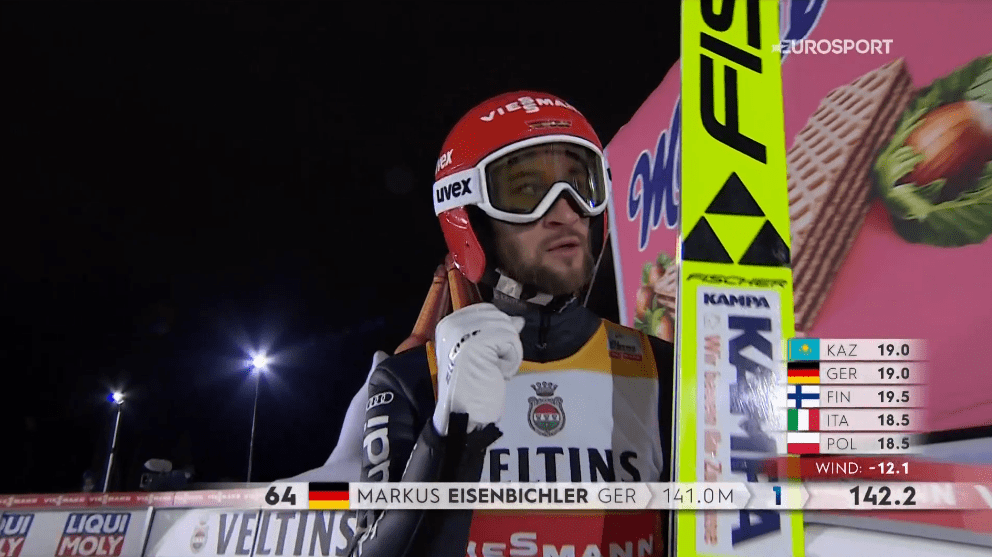 A legjobb formában levő norvég, Halvor Egner Granerud (4.) következett, aki 137 méterig tudott vitorlázni, ami a harmadik helyhez volt ekkor elegendő. Karl Geiger 135 méterrel szintén jól kezdett,ellenben Piotr Zylaval (27.), akinek az első ugrása nem volt az igazi, igaz kicsit peches is volt a körülményekkel. Az első két versenyt megnyerő Markus Eisenbichler (1.) viszont ismét remekelt és egy 141 méteres ugrással több, mint tíz pontot vert Johanssonra, így kényelmes előnnyel készülhetett a második sorozatra.