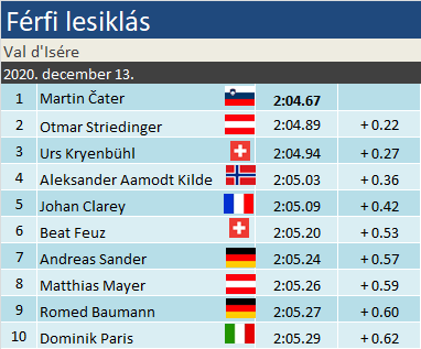 Martin Čater eredménylistáján korábban öt TOP-10-helyezés díszelgett, dobogón még nem állt. A hatszoros szlovén bajnoknak nem igazán jött össze a VK- szereplés eddig, fokozatosan esett mind hátrébb a rajtlistán. Mostani győzelme hatalmas szenzáció, szlovén legutóbb 2017 márciusában győzött Kvitfjellben. (A már említett Kline.) Otmar Striedinger így is élete legjobbját síelte lesiklásban. A 2019-es Hahnenkammon szerzett harmadik helye volt eddig a plafon. Ha nem változtak az osztrák válogatási elvek, akkor mostani pódiumával kivívta az indulást a világbajnokságon. Urs Kryenbühl szintén második dobogóját szerezte lesiklásban. A tavalyi (második) bormiói lesikláson másodikként végzett Paris mögött.