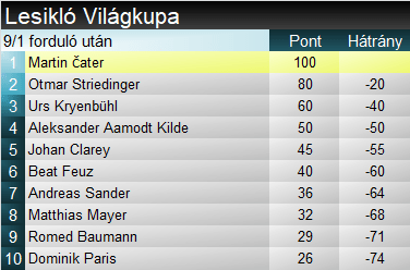 Martin Čater (1.) 41-es rajtszámmal élete futamát siklotta végig. A felső szakaszon sorosan tartotta Striedingert, az időközben jelentősen keményedett alsó részen pedig – remek sebességének hála – sikerült a maga javára fordítani a dolgot. Nem is kevéssel, végül 22 század döntött a szlovén mellett!
