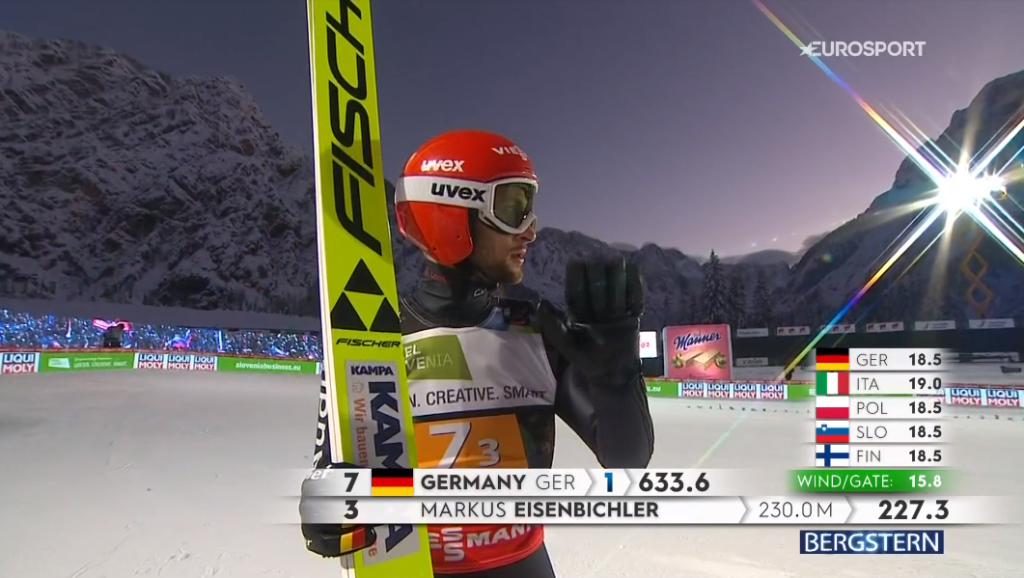 Dawid Kubackinak egyénileg egész biztosan nem ez a mostani volt a legerősebb hétvégéje, de egy 209 méteres ugrással azért könnyedén behozta a lengyeleket a harmadik helyre. Annyi jelentősége mindenesetre azért mégis csak lett ennek a kevésbé erős ugrásnak, hogy így a norvégoknál Alex Stöckl bátrabban vállalhatott némi kockázatot Halvor Egner Greneruddel, akit két beülővel lentebbről, a 10-es kapuból indított útjára. Granerud pedig repült is egy nagyot, és 234,5 méterrel gondoskodott arról, hogy a németek befejező emberének, Karl Geigernek is nagyot kelljen ugornia, ha nyerni akar.