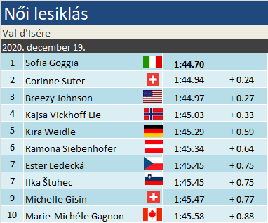 Sofia Goggia a nyolcadik győzelmét szerezte meg a Világkupában, az ötödiket lesiklásban. Legutóbb szinte napra pontosan egy éve Sankt Moritzban sikerült élen végeznie. Corinne Suter nyolcadszor állhatott dobogóra, ami a királykategóriát illeti. Tette mindezt úgy, hogy az első pódiumot 2019 februárjában gyűjtötte be. Breezy Johnson nagyon ráérzett a lejtőre, így nem okozott nagy meglepetést azzal, hogy egy napon belül második dobogóját is összehozta. Kérdés, más specifikumú pályán mire lesz képes. Világkupáról van szó, így külön öröm látni, hogy a TOP-10-ben kilenc különböző nemzet sízőjét találjuk.