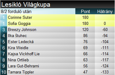 A szakágit holtversenyben vezeti a Goggia- Suter páros, s ha nem borul a papírforma, olybá tűnik, ők ketten kiemelkednek egy picit a mezőnyből. Bár pontot nem szerzett, tartja vezető helyét összetettben Vlhová. Ugyanakkor az eddigiek fényében újabb kemény ellenfelek tűntek fel a láthatáron. Gondolunk itt Gisinre, illetőleg Goggiára. Izgalmas folytatásra van kilátás. Kezdésnek holnap Szuper-G-ben.