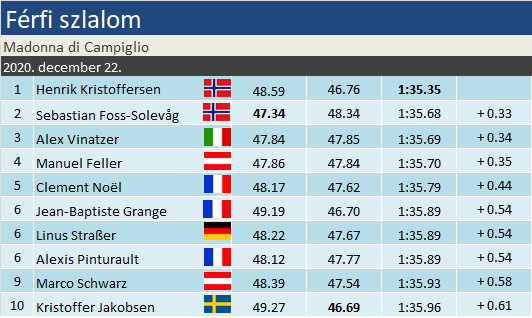 Henrik Kristoffersen váratlan, ám annál fontosabb győzelemmel zárta az évet. Ez a 22. pályafutása során, ezen a lejtőn harmadjára sikerült révbe érnie, öt és négy éve is az ő tiszteletére játszották le a himnuszt. A norvég évét jól fémjelzi, hogy a mostani versenyen kívül csak Schladmingban sikerült győznie. Talán ezzel kimászik végre a gödörből. Sebastian Foss-Solevåg hetedik idényét tapossa a szlalomosok elitjében. Harmadjára állt dobogón, két harmadik hely után karriercsúcsot ért el. Első pódiumát a 2015-ös zágrábi viadalon érte el, majd egy évre rá a Sankt Moritz-i idényzárón végzett még TOP-3-ban. Bár a legjobb tíz között azóta is sokszor megfordult, eléggé sokat kellett várnia az újabb dobogóra. Míg a norvég már közeleg a harminchoz, Alex Vinatzer abszolút a jövő ígérete, hiszen még csak 21 esztendős. A tavalyi junior-világbajnok idén januárban – ugyancsak – Zágrábban férkőzött a dobogóra. Idő kérdése, hogy meglesz az a győzelem.