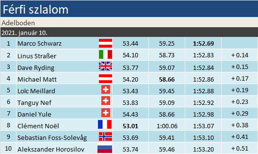 Rajtuk kívül Manfred Mölggöt érdemes kiemelni (14.), aki rég síelt ilyen remek futamot, még akkor is, ha a pálya második felén ő is messze volt a tökéletestől. A második tizenötös blokkból egyébként mindenki továbbjutott, leszámítva Stefano Grosst (31.). Igaz, a legjobbak közé már Hirschbühl (18.), Pertl (19.), Hadalin (22.), Maurberger (25.) és Razzoli (28.) sem fértek be.
