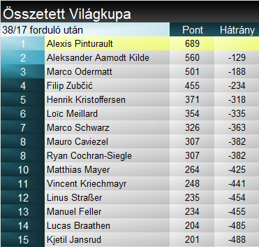 A pontversenyben épp Linus Straßer követi. A német idénre érett be igazán, mint műlesikló. Adelbodenben bizonyította, hogy szerdai győzelme nem kicsúszott eredmény, ráadásul kiszorította a világranglistán Pinturaul-t a hétből, így Wengenben már a német kap majd rajtszámot az első hétből. Dave Ryding karrierje során harmadszor állt dobogón. Először négy éve Kitzbühelben, majd két éve Oslóban. Idén még hiányzott tőle a két jó futam. Ezúttal összejött neki, és ez rögtön dobogót is ért. Összetettben Pinturault mindössze 14 ponttal növelte előnyét Kildével szemben.