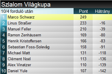 Marco Schwarz továbbra is remek műlesikló formában van. Idén egyedüliként a négy versenyből hármon is dobogón végzett. A szakágban eddig hét dobogó és nem egy elizgult elsőfutamos vezetést követően szerezte meg első győzelmét. Emellett paralellben és kombinációban is 1-1 sikerrel rendelkezik. Stabil dobogós helyeivel pedig a szakági tabellán is átvette a vezetést.