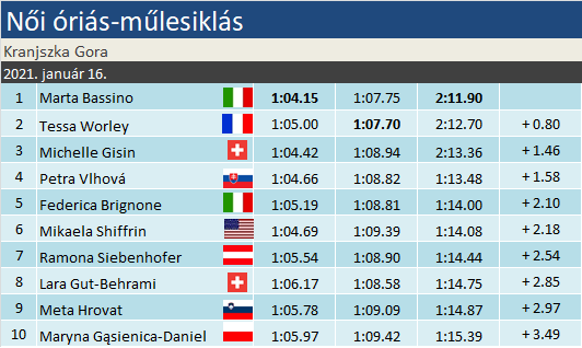 Marta Bassino négy óriás-műlesiklásból a harmadikat nyerte meg idén, s amikor célba ér, a jelek szerint nem lehet őt megverni. Tessa Worley egy régóta nem látott, erős menettel előreugrott a második helyre, míg Michelle Gisin mai teljesítményével az ötödik szakágban is eljutott a pódiumig. A negyedik helyen végzett Vlhová két másik riválisát, Brignonét és Shiffrint ugyanakkor megverte. A lengyel és a holland alpesi síelés régóta nem látott magasságokba emelkedik napjainkban.