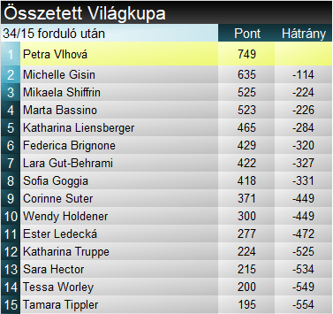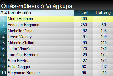 A szakágiban visszavette a vezetést Brignonétól Bassino. Előnye 50 pont, s jelen pillanatban úgy tűnik, leginkább rajta múlik, mennyire lesz izgalmas a folytatás. Szakágiban tartja vezető helyét Vlhová, de Gisin egyre nagyobb fenyegetést jelent számára. Főleg, ha óriásban tartósan verni tudja a szlovákot.