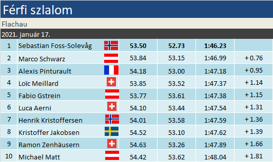Sebastian Foss-Solevåg számtalan elszalasztott, elizgult lehetőség után két győztes futamot síelt egymás után Flachauban, megszerezte ezzel karrierje első győzelmét. Az első futam után még 3 osztrák sorakozott a norvég mögött, végül Marco Schwarz maradt csak ott, aki Feller hibája révén ismét a szakági világkupa éllovasa is. Pinturault pedig dobogóval jelezte, Kilde sérülése után sem szeretné félvállról venni az összetettet. Ami a meglepetéseket illeti, a szülőhazája kötelékébe visszatérő AJ Ginnis 11. helye Görögország első pontjait jelentette.