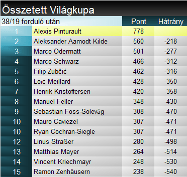 Marco Schwarz (4.) ma sokkalta többet kockáztatott, komoly alapidőt láthattunk. Meglepetésre viszont Henrik Kristoffersen (6.) végig meccsben volt vele. A norvég a tegnapi naphoz képest lecserélte felszerelését, talán ez is segíthetett. Danie Yule (22.) ma legalább célba ért, de továbbra sem tud a tavalyi szinthez mérhető menettel előrukkolni. Clement Noël a pálya felénél közel egy másodperces előnyből (!) kibillent az egyik kanyarban. Túlvállalta magát, nem fért be a következő kék kapuba.