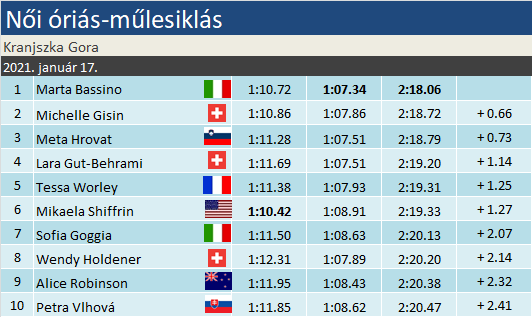 Marta Bassino energiatakarékos első futam után másodjára mutatta meg valós tudását, s kérdés nélkül húzta be negyedik óriás-műlesikló győzelmét a szezonban. Michelle Gisin tegnapi karriertörténeti dobogója után még egy fokkal feljebb lépett, s minthogy Vlhová csupán a 10. helyet szerezte meg, jelentősen megközelített a szlovákot összetettben. A dobogó harmadik fokára, akárcsak egy éve ilyenkor, a tősgyökeres helyi Meta Hrovat állhatott fel. Kiemelendő még Lara Gut-Behrami teljesítménye, aki csak egyetlen hellyel szorult le a TOP-3-ból. A délelőtti éllovas Shiffrin gyengélkedett délután, visszacsúszott a hatodik pozícióba.