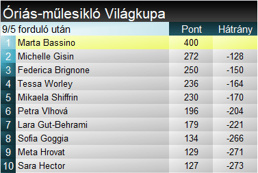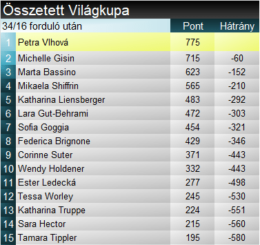 Összetettben mind szorosabb a helyzet, köszönhetően Vlhová viszonylagos hétvégi gyengélkedésének. Gisin már egy futamgyőzelemnyi különbségen belülre került, s a jövő heti háromfutamos gyorsasági hétvégén még akár az is benne van a pakliban, hogy élre áll a pontversenyben. Ugyanakkor egyre komolyabban oda kell figyelni Bassinóra, aki gyors számokban újabb szintet lépett előre, továbbá szlalomban is minőségi szektorokat láthattunk tőle. Még ha mindig nem is ér célt.