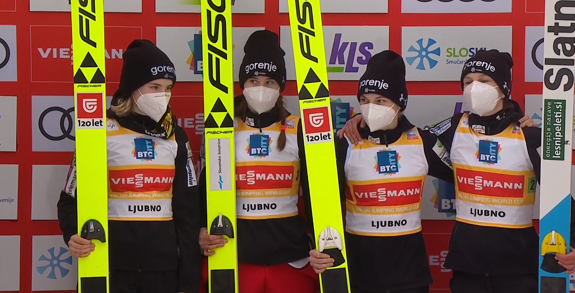 A szombat kora délután rendezett csapatversenyt az elejétől kezdve dominálták a hazai ugrók, az első sorozatban Ema Klinec 96 méterrel rögtön a verseny leghosszabb ugrásával nyitott, innentől kezdve pedig a Spela Rogeljel, Ursa Bogatajjal és Nika Kriznarral felálló csapat egyetlen hiba nélkül hozta le a versenyt, így megérdemelt győzelmet arattak. A második helyért a norvégok és az osztrákok vívtak nagy csatát, amiből végül Maren Lundbyék jöttek ki jobban, annak ellenére, hogy egy “bukott” ugrásuk is volt (Eirin Maria Kvandal tette le a kezét a második sorozatban). A ramsaui hétvége után a nemzetek pontversenyét vezető Ausztria ezzel harmadik lett, így a verseny végére a sárga trikó is a szlovénokhoz került.