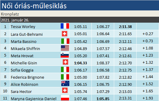 Tessa Worley remek főpróbát tartott a világbajnokság előtt, megszerezte 14. győzelmét a Világkupában. Az elsőt idén, sőt 2018 októbere óta nem nyert versenyt. Lara Gut-Behrami még régebb óta nem állt dobogón, egész pontosan lassan 4 éve utoljára. Lara bombaformába lendült, ha kijön számára a lépés, hatalmasat alakíthat Cortinán. Hiába lett ma csak harmadik, az óriás-műlesiklás favoritja kétségkívül Marta Bassino lesz, ez a 11. dobogója a szakágban.