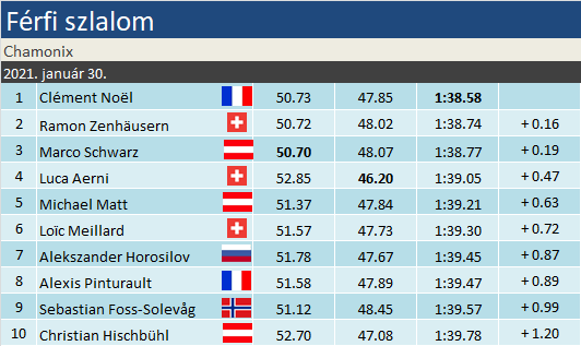 Parázs csatát, komoly izgalmakat hozott az első Chamonix-i szlalom a férfiaknál. Az első futam első három helyezettje 3 századon belül állt, és a dobogó leosztása a délutáni tocsogós időben sem változott. Dacára annak, hogy Luca Aerni a 29. helyről startolva kis híján felfért a pódiumra. Hazai győzelem született, miután Clément Noël ezúttal lehozott két futamot komoly rontás nélkül. Ramon Zenhäusern december vége óta állt újra dobogóra, míg Marco Schwarz szezonbeli hetedik TOP-3-helyezésével karnyújtásnyira került a szakági kristálygömbhöz.
