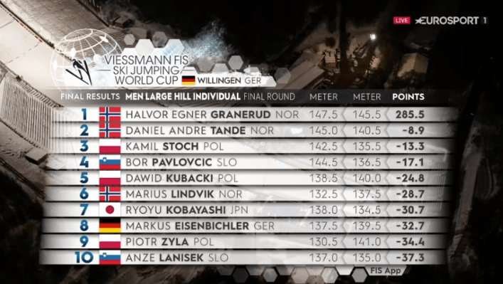 A Világkupa éllovasa, a norvég Granerud nyerte a szombati versenyt Willingenben és vette át a hat ugrás összesítésében is a vezetést. Rajta kívül biztos, hogy szívesen emlékszik a mai napra a két dobogós, azaz Tande és Stoch is, míg a szlovén Pavlovcic élete legjobb VK eredményével zárt, Ammann pedig a szezonban először szerzett pontot a tizenkettedik helyével. A németek és az osztrákok viszont mérsékelt teljesítményt nyújtottak, akárcsak a selejtező győztese a lengyel Stekala, aki ma csak a huszadik pozícióban zárt, így már nem ő viseli a piros trikót.