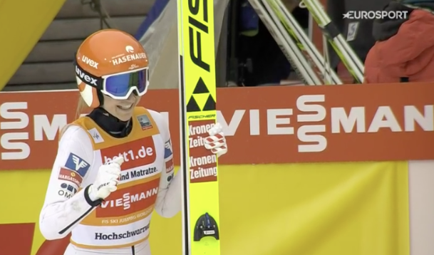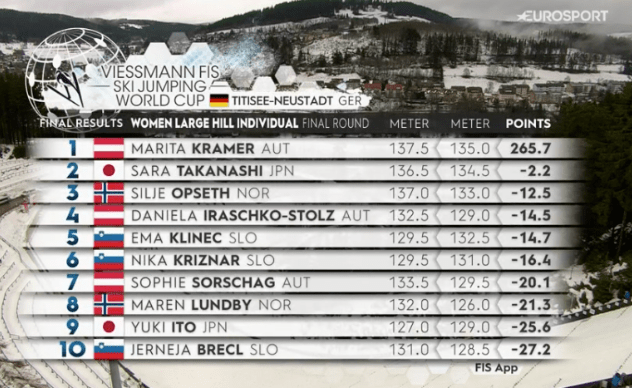 Ami az élmezőnyt illeti, Marita Kramer (137.5 m) továbbra is imponál teljesítményt nyújt – ezúttal az első körben a szélviszonyok, és úgy általában az időjárás is megfelelő volt a korrekt eredményekhez. A szombati versenyt is nyerő osztrák mögött a japán Takanashi (136.5 m) és honfitársa Iraschko-Stolz (132.5 m) végzett, de utóbbi már majd tíz pont hátrányból várta a második kört. A bronzérem megtartásához viszont figyelnie kell hátrafelé is, hiszen 3-3 norvég és szlovén ugró lihegett a nyakán osztrák kolléganője, Sorschag mellett.